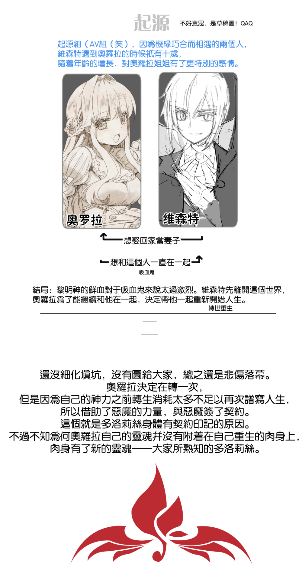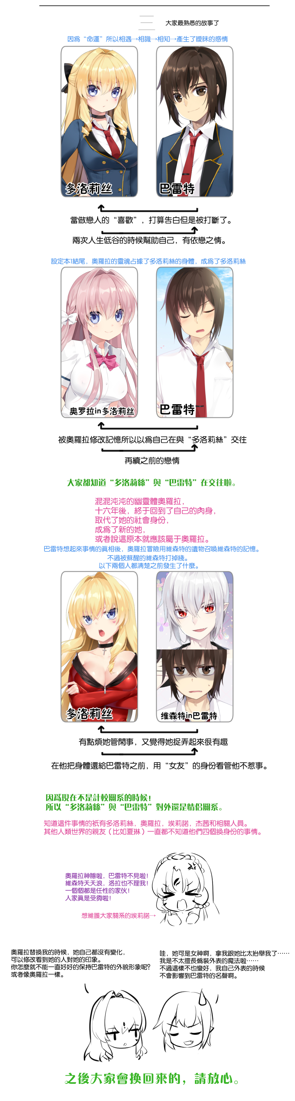 By M, VV2017年11月16日-Palingenesis-, -人设-多洛莉丝, 奥罗拉, 巴雷特, 维森特 按照时间线写的目前的剧情进程,方便大家理解一下总是(?)换身体的四人组的关系。 其实也没有总是啦……嗯……是分阶段的……嗯……